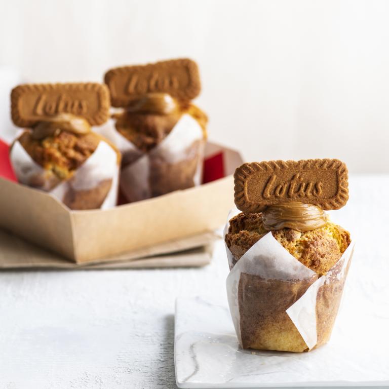 Pour finir, verser un peu de pâte à tartiner Biscoff® sur chaque muffin et y déposer un biscuit Biscoff®.
