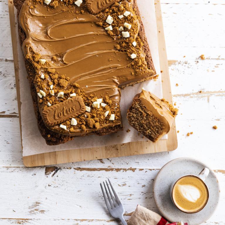 Couper le gâteau en parts carrées et garnir chaque part d’un biscuit Biscoff®.