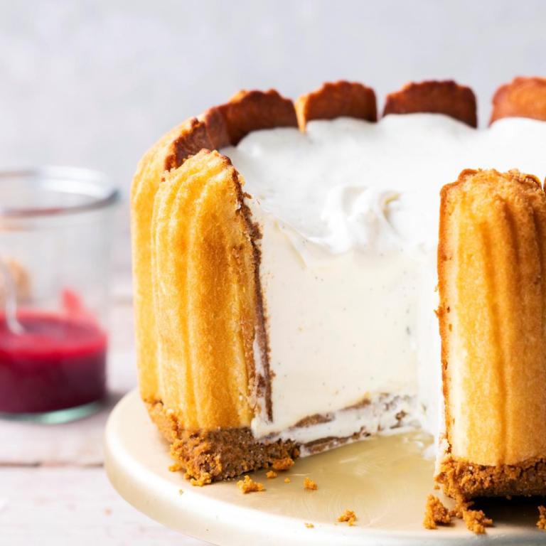 Snij ongeveer 2 cm van de Lotus® Madeleines. Neem de vorm uit de ijskast en schik de madeleines, met de gesneden kant naar beneden, rondom de buitenkant om zo een kraag te vormen (zie foto). Giet het roomkaasbeslag erin en zet in de ijskast voor 12u.